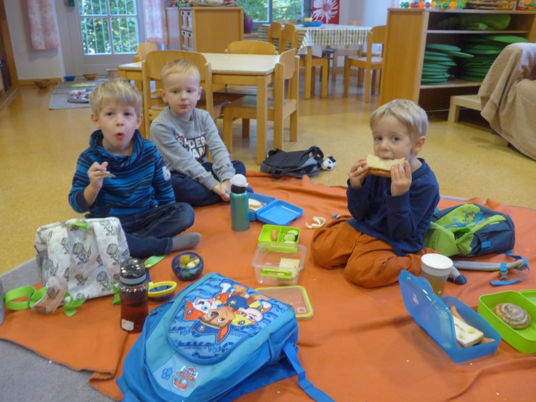 Die Brotzeit findet gleitend statt, d. h. jedes Kind kann selbst entscheiden, wann es sein Frühstück essen möchte.